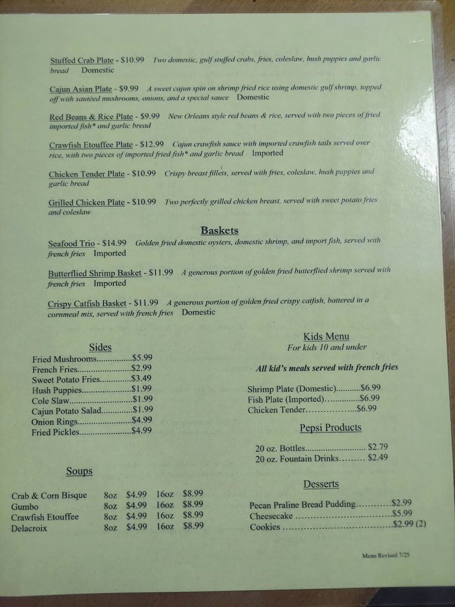 Overall, the menu reflects a balance of familiar favorites easy to enjoy any day of the week, with enough variety to appeal to seafood lovers exploring Southern flavors in a welcoming setting.
